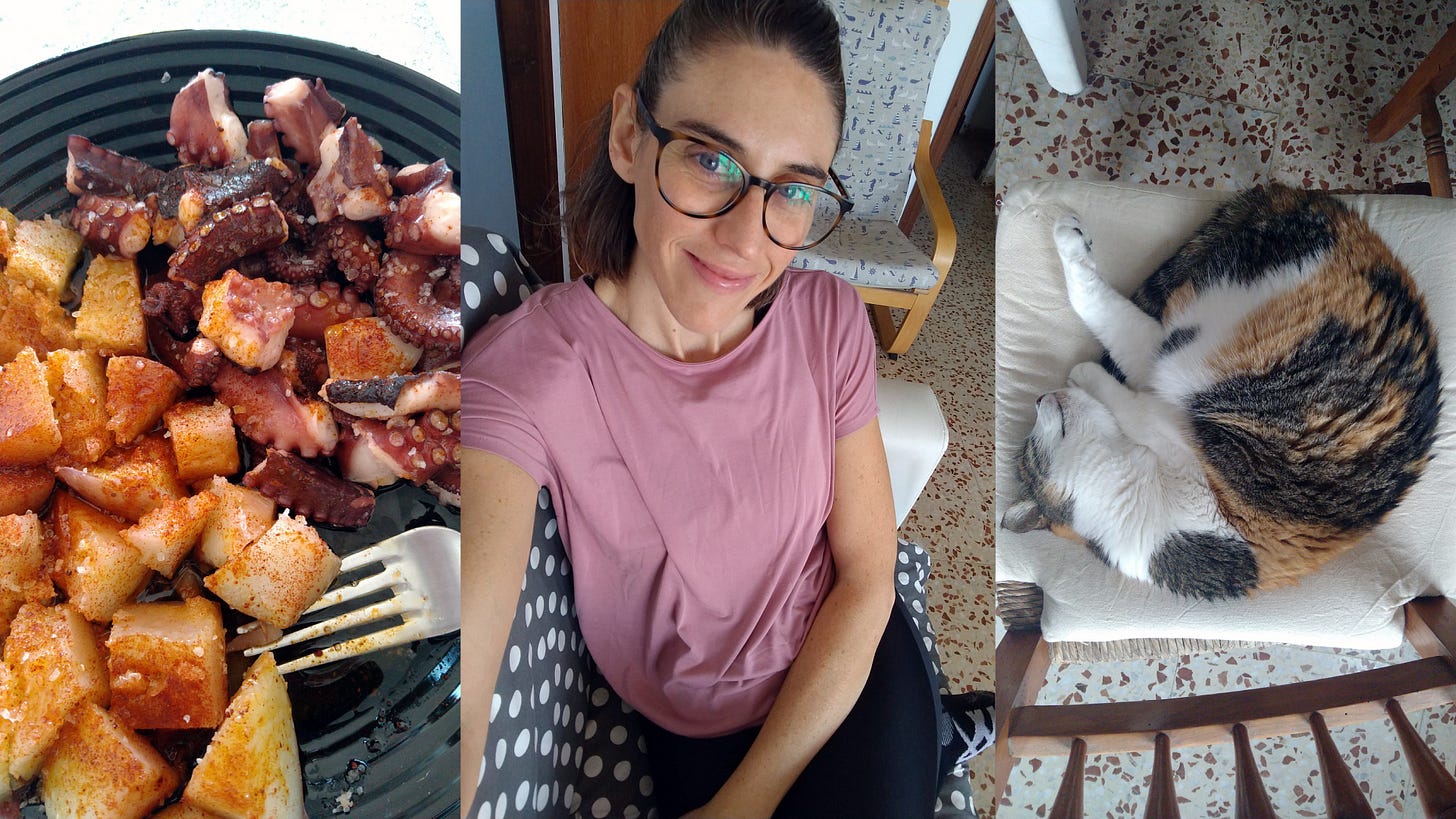 I've been here for three days now. And I have to be honest, I haven't completely stopped working, but I'm taking a slower pace. I'm allowing myself to sleep in, with no alarms to jolt me awake. My days are filled with long walks, and moments of peace sitting on my favorite bench overlooking the vast and soothing Mediterranean Sea. I'm enjoying delicious homemade meals and precious time with my dad and our 20-year-old cat. And you know what? I'm feeling a lot better already. I feel calmer, more focused, and well-rested.
